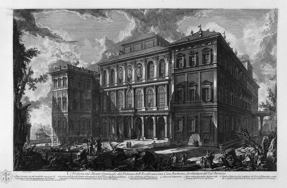 Wir bieten Ihnen eine handgefertigte Reproduktion auf Leinwand des berühmten Kunstwerks 'Ansicht des Palastes Stopani' von Giovanni Battista Piranesi, aus dem Reproduktionsmuseum.