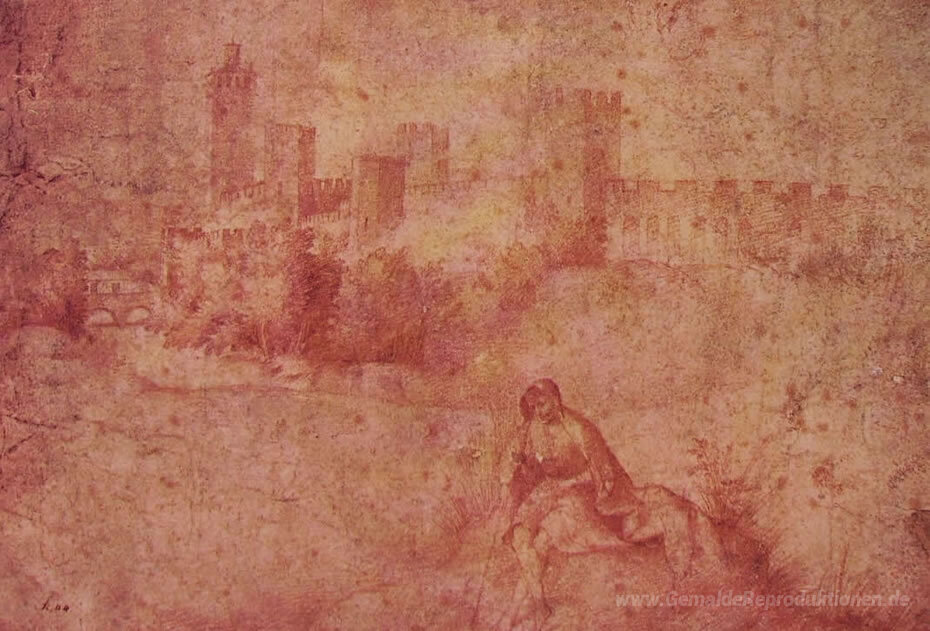 Wir bieten Ihnen eine handgefertigte Reproduktion auf Leinwand des berühmten Kunstwerks 'Ansicht von Castelfranco und Hirten' von Giorgione, aus dem Reproduktionsmuseum.