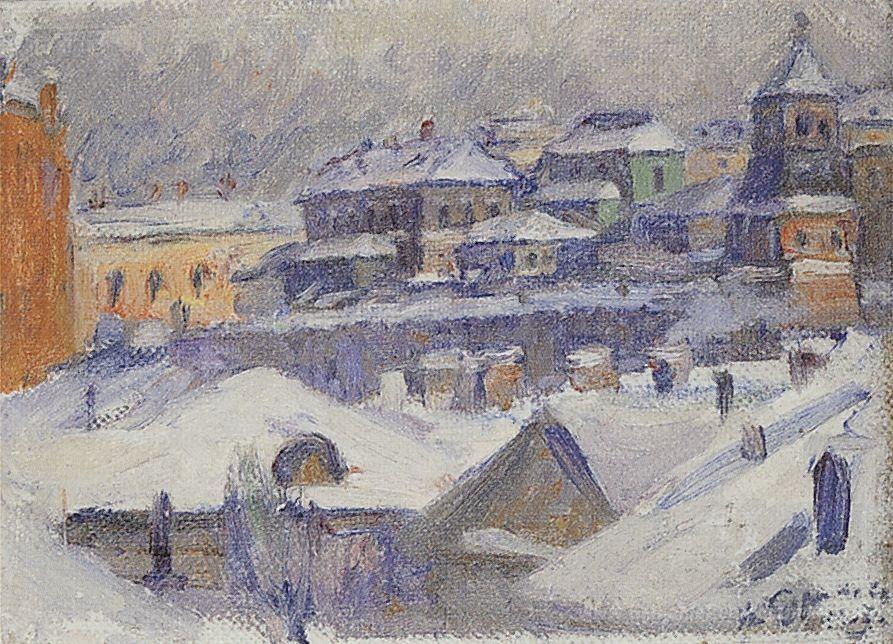 Wir bieten Ihnen eine handgefertigte Reproduktion auf Leinwand des berühmten Kunstwerks 'Ansicht von Moskau' von Vasily Surikov, aus dem Reproduktionsmuseum.