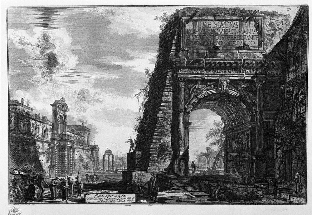 Wir bieten Ihnen eine handgefertigte Reproduktion auf Leinwand des berühmten Kunstwerks 'Blick auf den Titusbogen' von Giovanni Battista Piranesi, aus dem Reproduktionsmuseum.