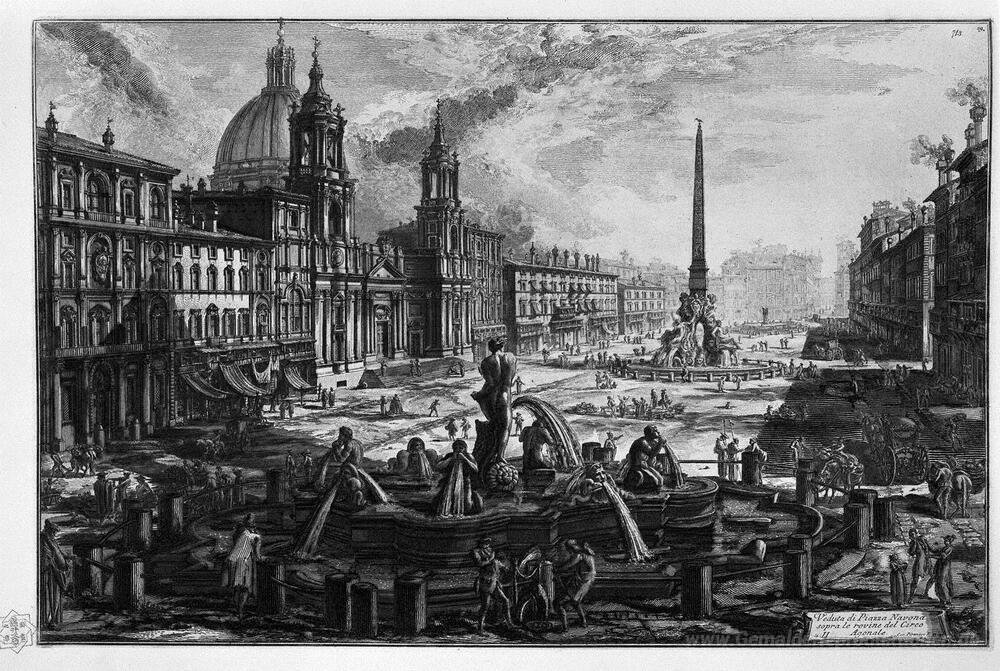 Wir bieten Ihnen eine handgefertigte Reproduktion auf Leinwand des berühmten Kunstwerks 'Blick auf die Piazza Navona auf den Ruinen des Zirkus Agonale' von Giovanni Battista Piranesi, aus dem Reproduktionsmuseum.