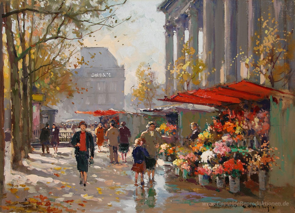 Wir bieten Ihnen eine handgefertigte Reproduktion auf Leinwand des berühmten Kunstwerks 'Blumen-Verkäufer in La Madeleine' von Edouard Cortes, aus dem Reproduktionsmuseum.