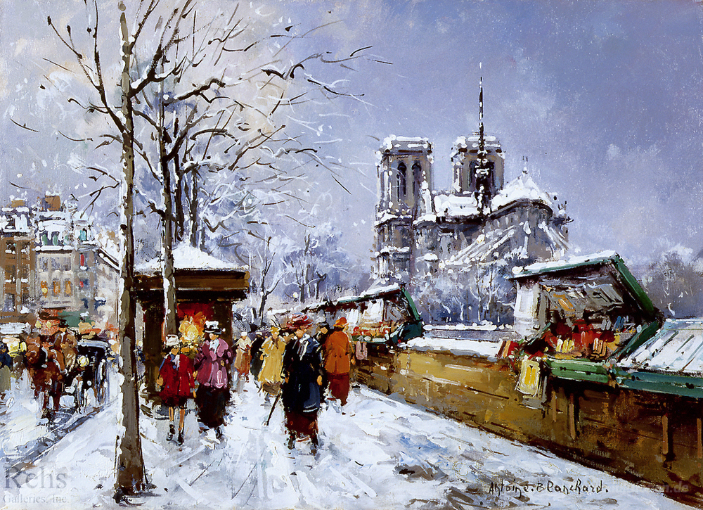 Wir bieten Ihnen eine handgefertigte Reproduktion auf Leinwand des berühmten Kunstwerks 'Booksellers Notre Dame, Winter' von Antoine Blanchard, aus dem Reproduktionsmuseum.