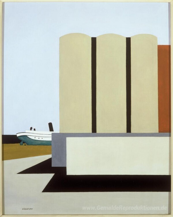 Wir bieten Ihnen eine handgefertigte Reproduktion auf Leinwand des berühmten Kunstwerks 'Boot und Grain Elevators No. 2' von Ralston Crawford, aus dem Reproduktionsmuseum.