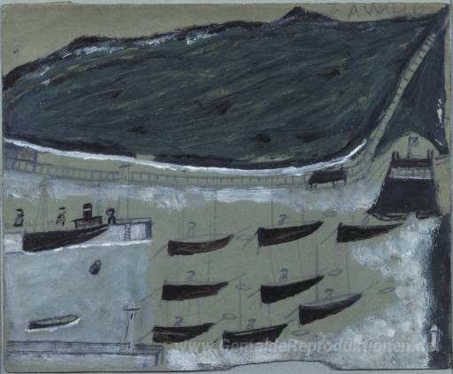 Wir bieten Ihnen eine handgefertigte Reproduktion auf Leinwand des berühmten Kunstwerks 'Boote im Ruhezustand in Mounts Bay' von Alfred Wallis, aus dem Reproduktionsmuseum.