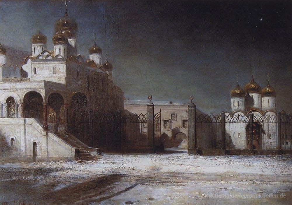 Wir bieten Ihnen eine handgefertigte Reproduktion auf Leinwand des berühmten Kunstwerks 'Cathedral Square im Moskauer Kreml in der Nacht' von Aleksey Savrasov, aus dem Reproduktionsmuseum.