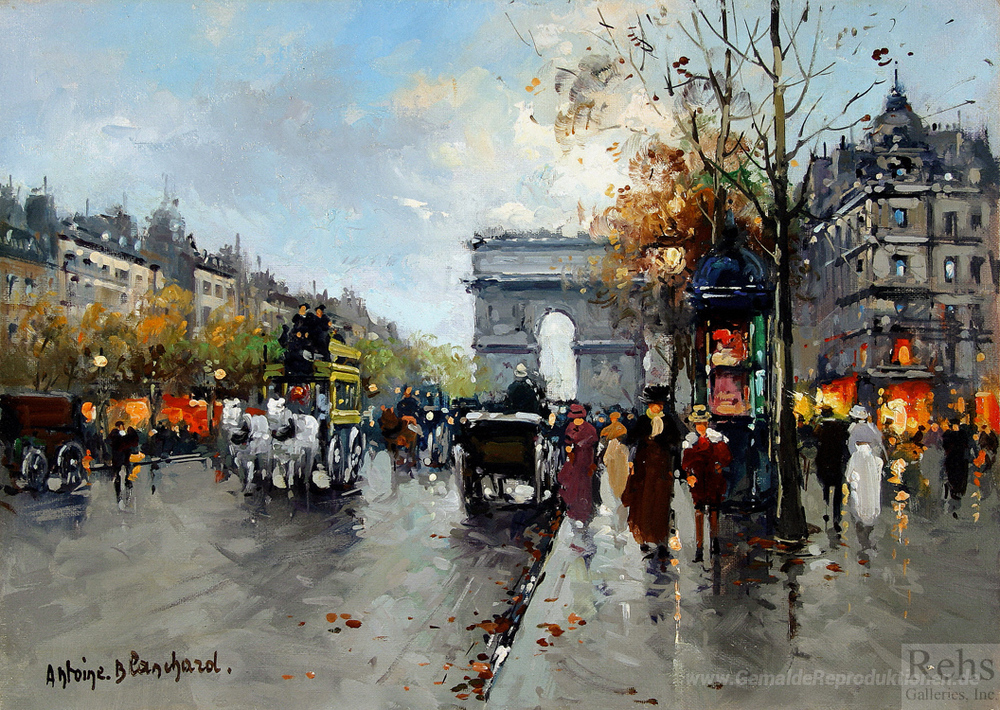Wir bieten Ihnen eine handgefertigte Reproduktion auf Leinwand des berühmten Kunstwerks 'Champs Elysees' von Antoine Blanchard, aus dem Reproduktionsmuseum.