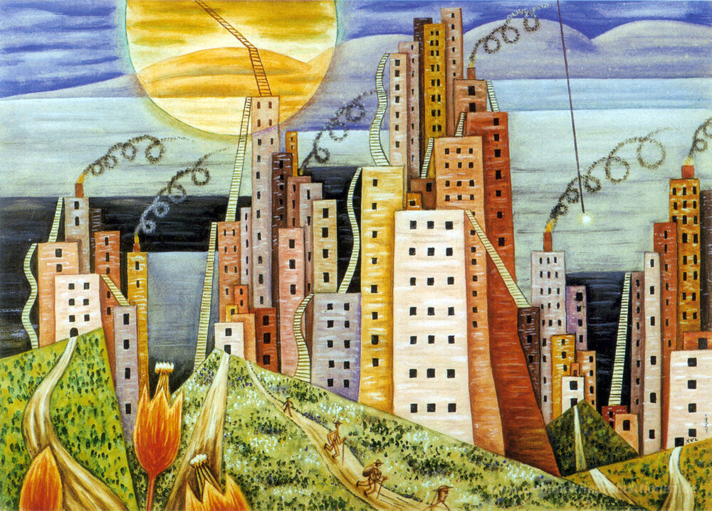 Wir bieten Ihnen eine handgefertigte Reproduktion auf Leinwand des berühmten Kunstwerks 'Ciuda lagui' von Xul Solar, aus dem Reproduktionsmuseum.