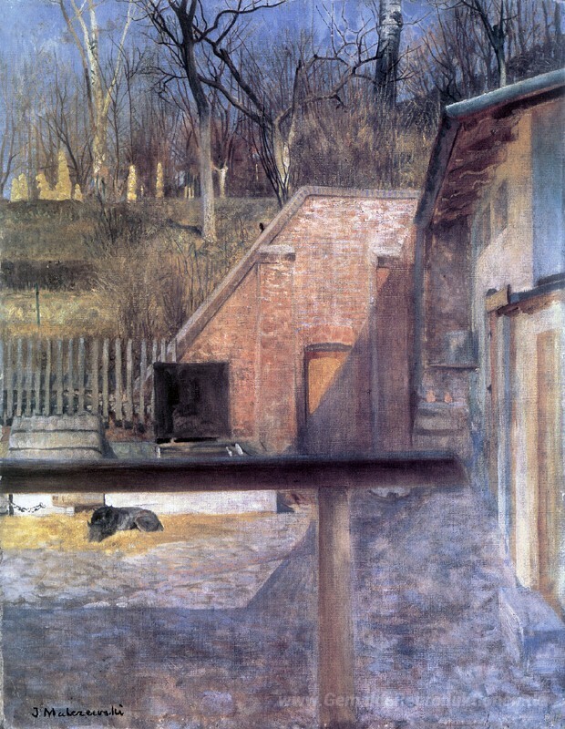 Wir bieten Ihnen eine handgefertigte Reproduktion auf Leinwand des berühmten Kunstwerks 'Courtyard im Zoo' von Jacek Malczewski, aus dem Reproduktionsmuseum.