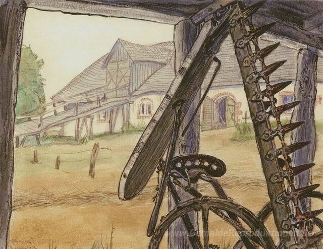 Wir bieten Ihnen eine handgefertigte Reproduktion auf Leinwand des berühmten Kunstwerks 'Courtyard in Shaukenay' von Mstislav Dobuzhinsky, aus dem Reproduktionsmuseum.