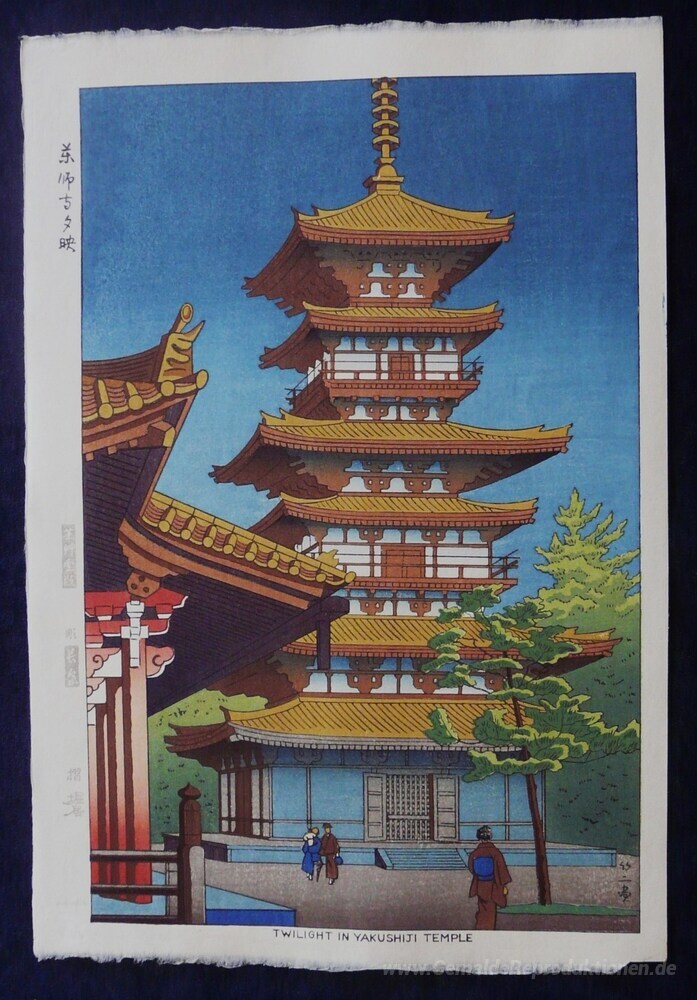 Wir bieten Ihnen eine handgefertigte Reproduktion auf Leinwand des berühmten Kunstwerks 'Dämmerung Yakushiji Temple' von Asano Takeji, aus dem Reproduktionsmuseum.