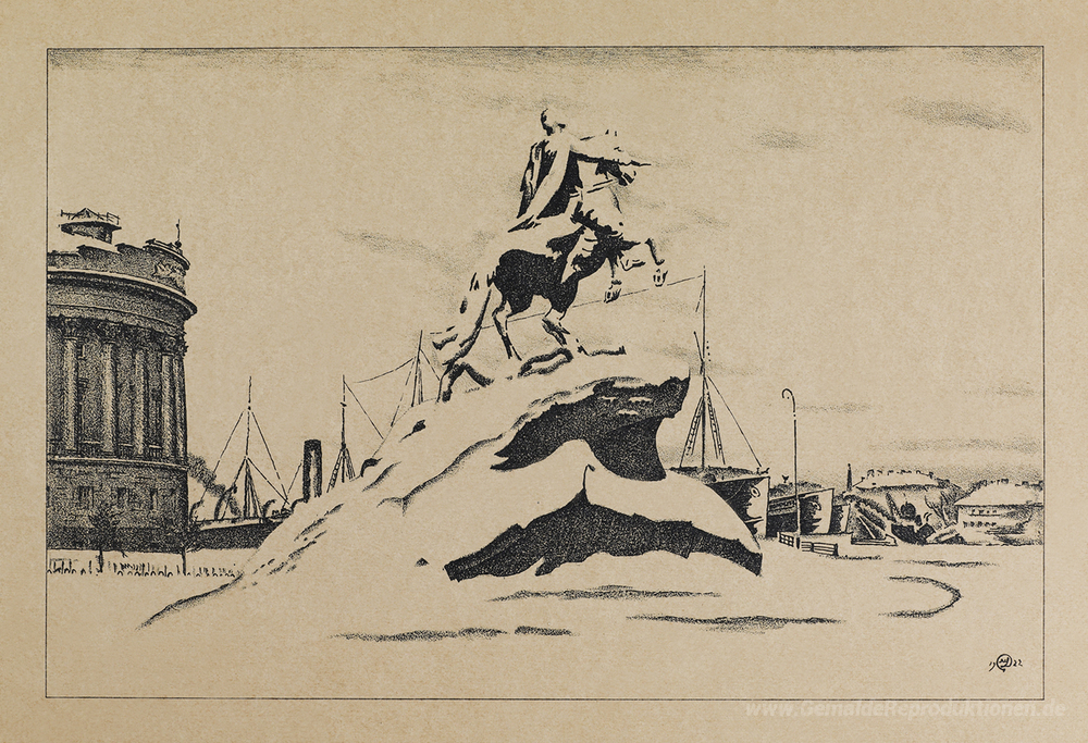 Wir bieten Ihnen eine handgefertigte Reproduktion auf Leinwand des berühmten Kunstwerks 'Denkmal für Peter den Großen' von Mstislav Dobuzhinsky, aus dem Reproduktionsmuseum.