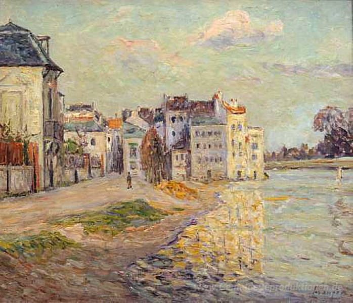 Wir bieten Ihnen eine handgefertigte Reproduktion auf Leinwand des berühmten Kunstwerks 'Der Damm des Lagny unter Flutwasser' von Maxime Maufra, aus dem Reproduktionsmuseum.