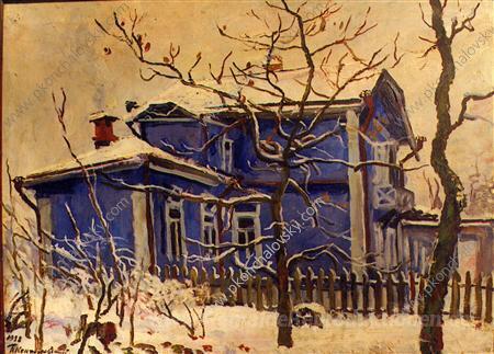 Wir bieten Ihnen eine handgefertigte Reproduktion auf Leinwand des berühmten Kunstwerks 'Der erste Schnee. Das blaue Häuschen.' von Pyotr Konchalovsky, aus dem Reproduktionsmuseum.