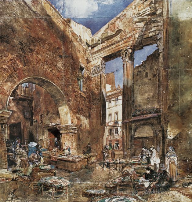 Wir bieten Ihnen eine handgefertigte Reproduktion auf Leinwand des berühmten Kunstwerks 'Der Fischmarkt in Rom' von Rudolf von Alt, aus dem Reproduktionsmuseum.