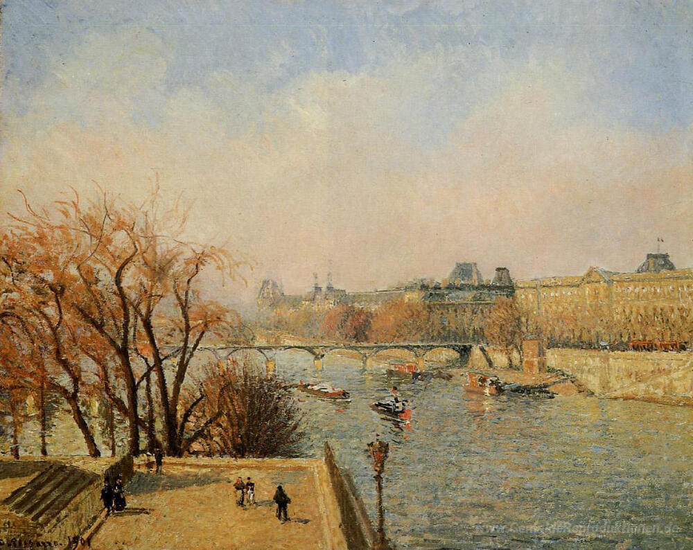 Wir bieten Ihnen eine handgefertigte Reproduktion auf Leinwand des berühmten Kunstwerks 'Der Louvre, Morgen, Sonnen' von Camille Pissarro, aus dem Reproduktionsmuseum.