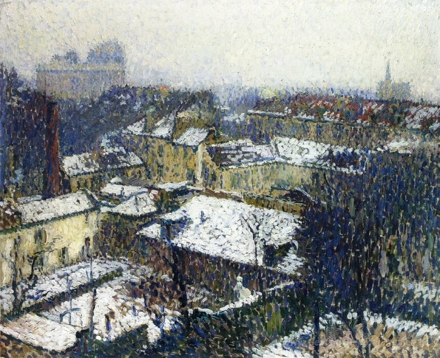 Wir bieten Ihnen eine handgefertigte Reproduktion auf Leinwand des berühmten Kunstwerks 'Die Dächer von Paris im Schnee, der Blick aus dem Atelier des Kü' von Henri Martin, aus dem Reproduktionsmuseum.