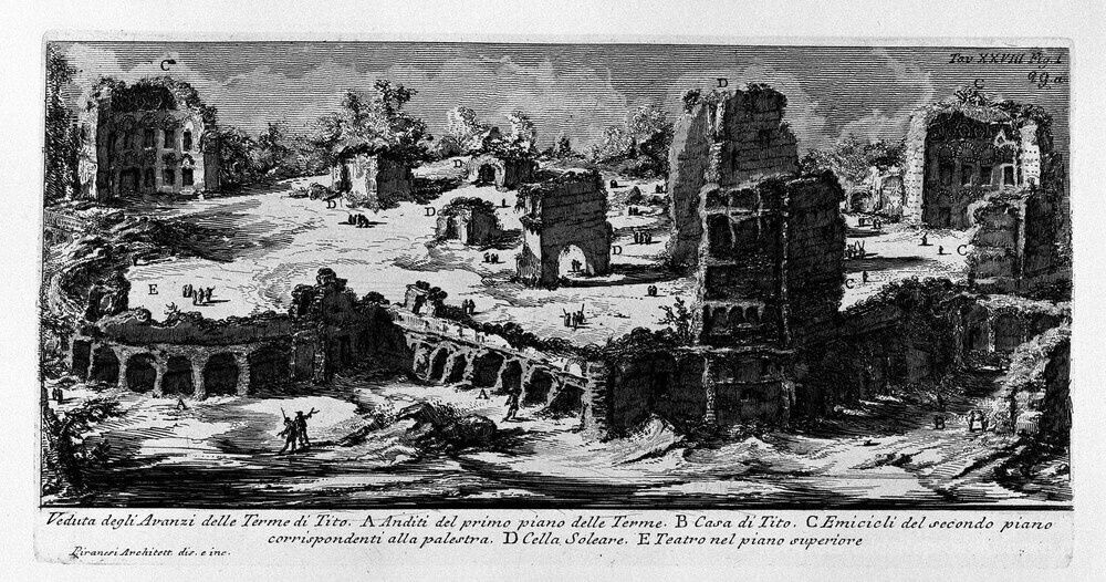 Wir bieten Ihnen eine handgefertigte Reproduktion auf Leinwand des berühmten Kunstwerks 'Die römische Altertümer, t. 1, Tafel XXVIII. "Bäder von Titus" (' von Giovanni Battista Piranesi, aus dem Reproduktionsmuseum.