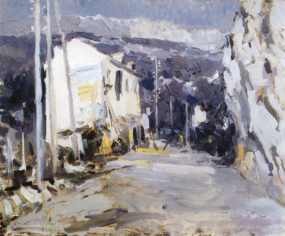 Wir bieten Ihnen eine handgefertigte Reproduktion auf Leinwand des berühmten Kunstwerks 'Die Straße in der südlichen Stadt' von Konstantin Korovin, aus dem Reproduktionsmuseum.