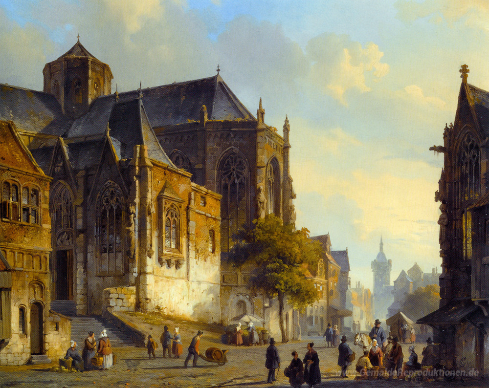 Wir bieten Ihnen eine handgefertigte Reproduktion auf Leinwand des berühmten Kunstwerks 'Die Zahlen auf einem Marktplatz in einer niederländischen Stadt' von Cornelis Springer, aus dem Reproduktionsmuseum.