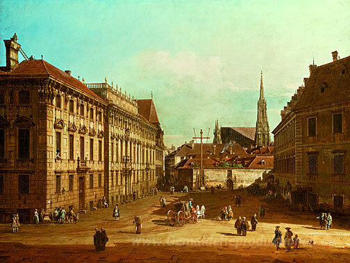 Wir bieten Ihnen eine handgefertigte Reproduktion auf Leinwand des berühmten Kunstwerks 'Ein Blick auf das Palais Lobkowicz in Wien' von Bernardo Bellotto, aus dem Reproduktionsmuseum.