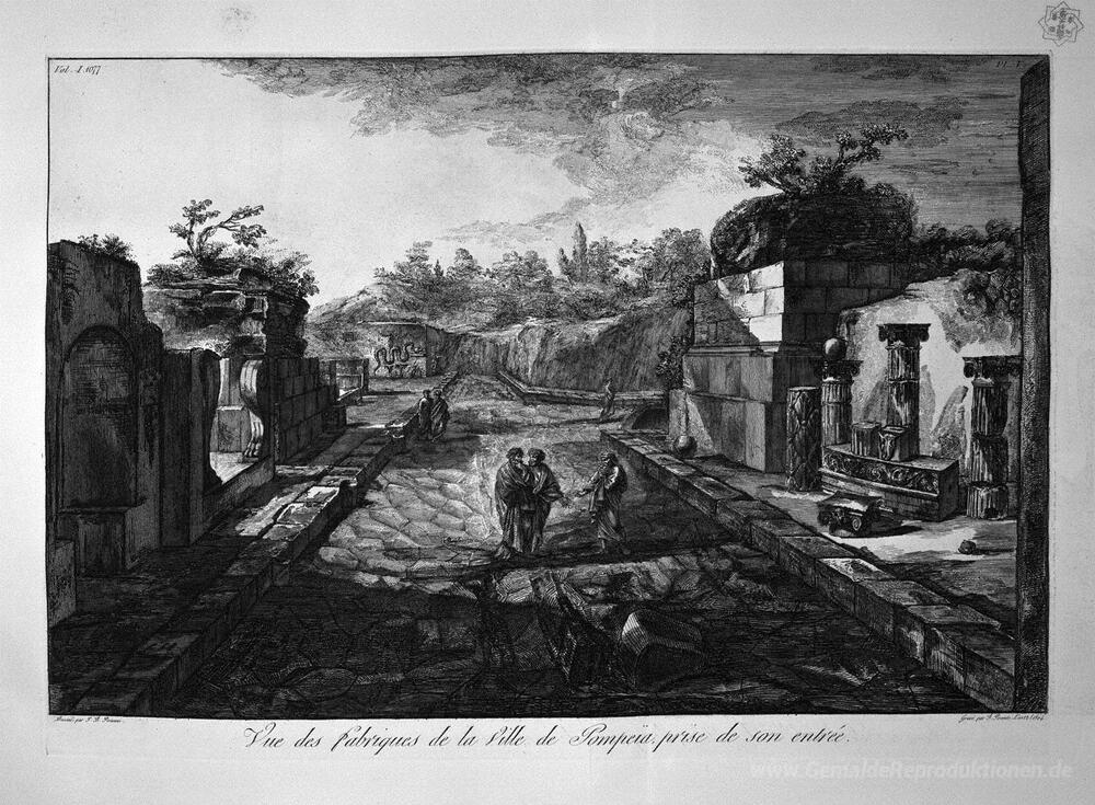 Wir bieten Ihnen eine handgefertigte Reproduktion auf Leinwand des berühmten Kunstwerks 'Eingang in die Stadt Pompeji mit den bestehenden Fabriken vor de' von Giovanni Battista Piranesi, aus dem Reproduktionsmuseum.