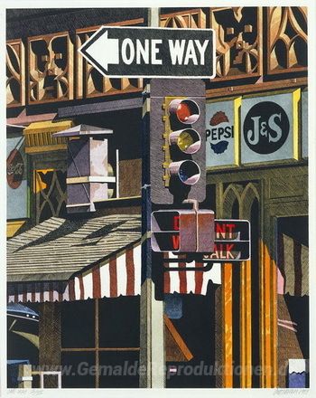 Wir bieten Ihnen eine handgefertigte Reproduktion auf Leinwand des berühmten Kunstwerks 'Einweg' von Robert Cottingham, aus dem Reproduktionsmuseum.