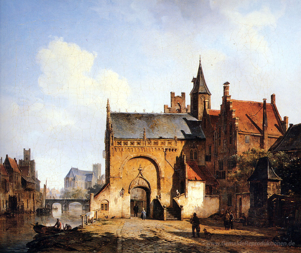 Wir bieten Ihnen eine handgefertigte Reproduktion auf Leinwand des berühmten Kunstwerks 'Fantasie cityview von Maassluis' von Cornelis Springer, aus dem Reproduktionsmuseum.
