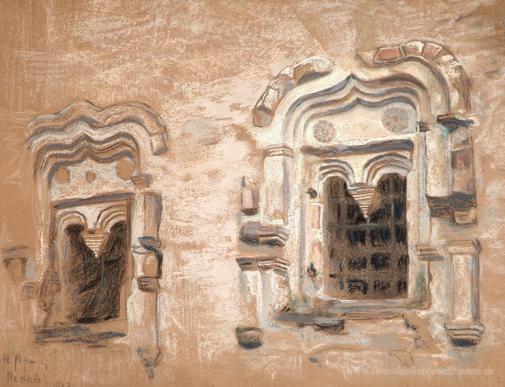 Wir bieten Ihnen eine handgefertigte Reproduktion auf Leinwand des berühmten Kunstwerks 'Fenster des Hauses des XVII Jahrhunderts' von Nicholas Roerich, aus dem Reproduktionsmuseum.