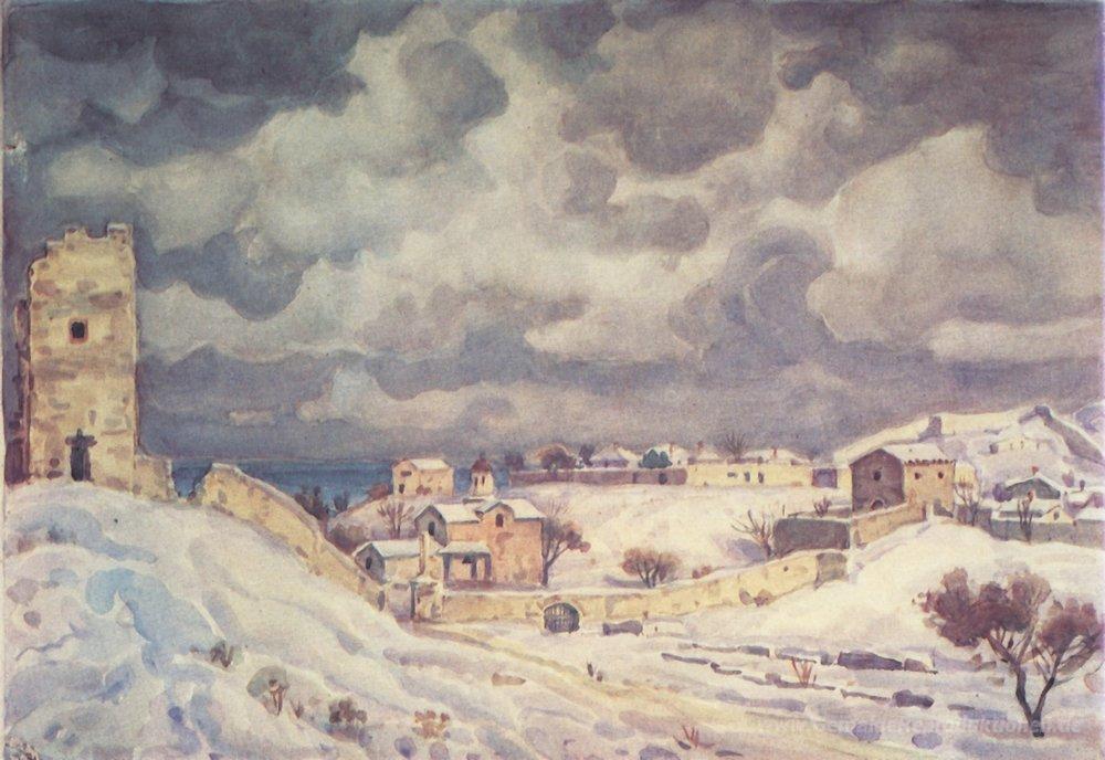 Wir bieten Ihnen eine handgefertigte Reproduktion auf Leinwand des berühmten Kunstwerks 'Feodosia im Winter' von Konstantin Bogaevsky, aus dem Reproduktionsmuseum.