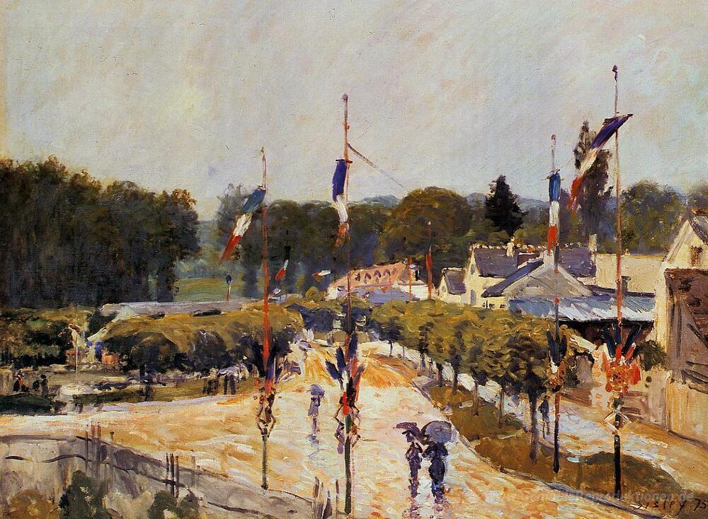 Wir bieten Ihnen eine handgefertigte Reproduktion auf Leinwand des berühmten Kunstwerks 'Fete Day at Marly le Roi (Der vierzehnte von Juli in Marly le Ro' von Alfred Sisley, aus dem Reproduktionsmuseum.