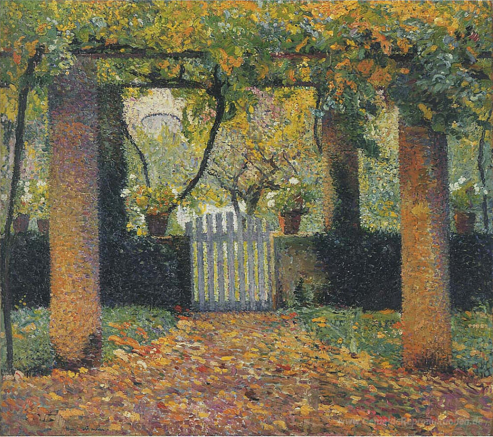 Wir bieten Ihnen eine handgefertigte Reproduktion auf Leinwand des berühmten Kunstwerks 'Gartentür in Bower' von Henri Martin, aus dem Reproduktionsmuseum.