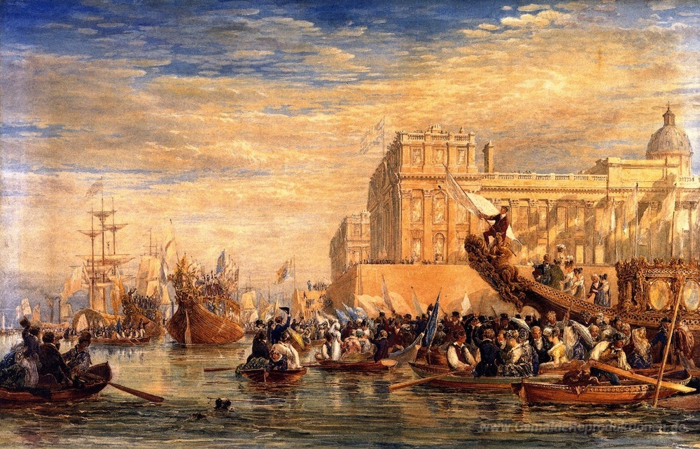 Wir bieten Ihnen eine handgefertigte Reproduktion auf Leinwand des berühmten Kunstwerks 'George IV Einschiffung für Schottland in Greenwich' von David Cox, aus dem Reproduktionsmuseum.
