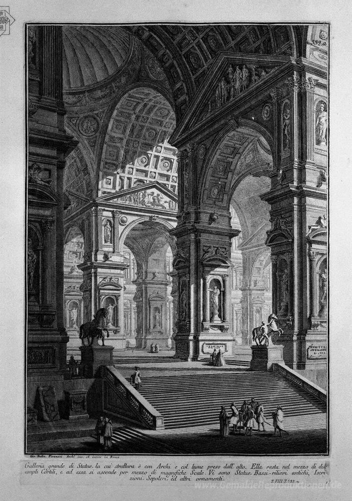 Wir bieten Ihnen eine handgefertigte Reproduktion auf Leinwand des berühmten Kunstwerks 'Große Galerie der Statuen in der Mitte zwei große Innenhöfe (Tit' von Giovanni Battista Piranesi, aus dem Reproduktionsmuseum.