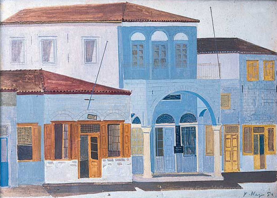 Wir bieten Ihnen eine handgefertigte Reproduktion auf Leinwand des berühmten Kunstwerks 'Häuser in Hydra' von Nikos Nikolaou, aus dem Reproduktionsmuseum.