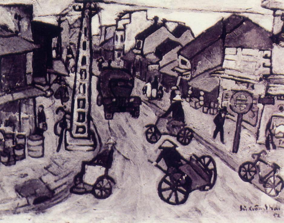 Wir bieten Ihnen eine handgefertigte Reproduktion auf Leinwand des berühmten Kunstwerks 'Hanoi Straße' von Bui Xuan Phai, aus dem Reproduktionsmuseum.