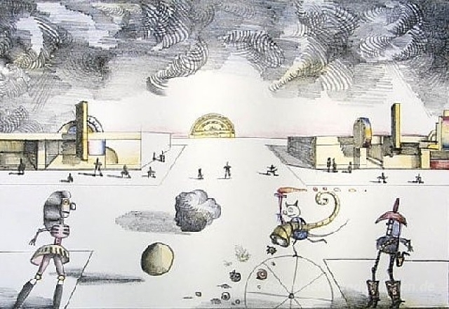 Wir bieten Ihnen eine handgefertigte Reproduktion auf Leinwand des berühmten Kunstwerks 'Hauptstraße' von Saul Steinberg, aus dem Reproduktionsmuseum.