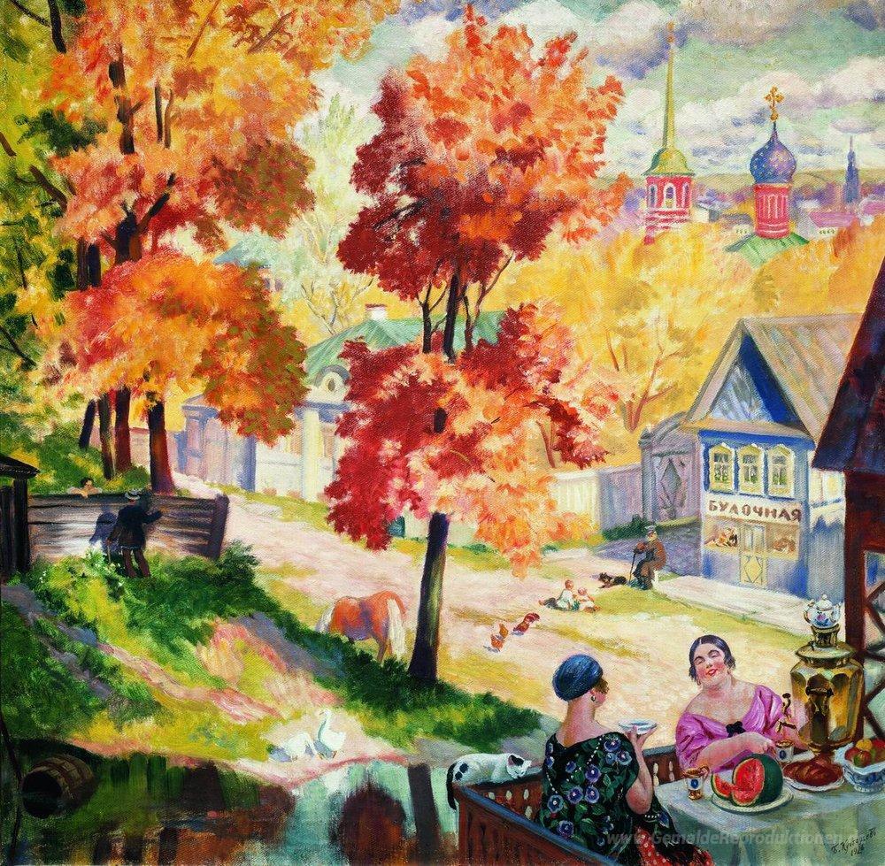 Wir bieten Ihnen eine handgefertigte Reproduktion auf Leinwand des berühmten Kunstwerks 'Herbst in der Provinz. Teezeit' von Boris Kustodiev, aus dem Reproduktionsmuseum.