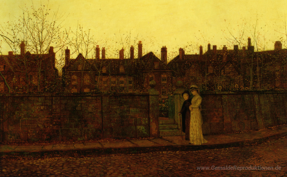 Wir bieten Ihnen eine handgefertigte Reproduktion auf Leinwand des berühmten Kunstwerks 'Im Goldenen Gloaming' von John Atkinson Grimshaw, aus dem Reproduktionsmuseum.