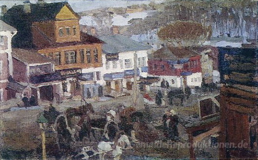 Wir bieten Ihnen eine handgefertigte Reproduktion auf Leinwand des berühmten Kunstwerks 'In der Kloster Mietskasernen. In der Nähe Troitse-Sergijew' von Konstantin Yuon, aus dem Reproduktionsmuseum.