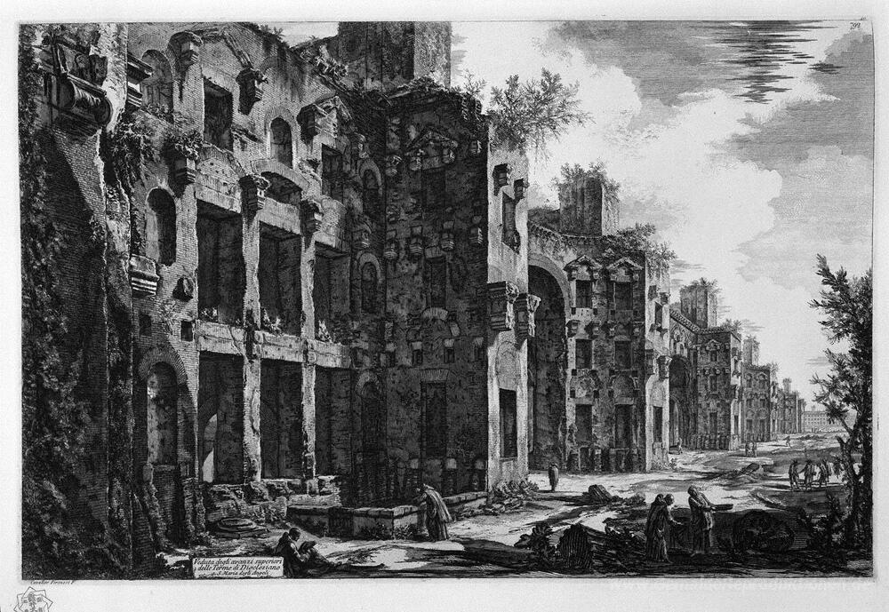 Wir bieten Ihnen eine handgefertigte Reproduktion auf Leinwand des berühmten Kunstwerks 'Informieren Sie sich über die Überreste der Thermen des Diokleti' von Giovanni Battista Piranesi, aus dem Reproduktionsmuseum.