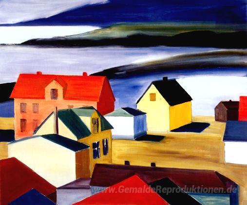 Wir bieten Ihnen eine handgefertigte Reproduktion auf Leinwand des berühmten Kunstwerks 'Isländischen Dorf' von Louisa Matthiasdottir, aus dem Reproduktionsmuseum.