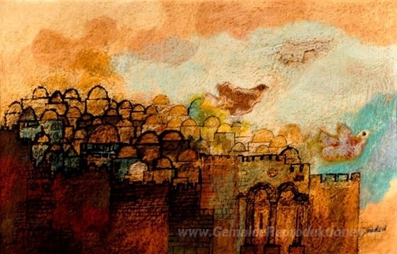 Wir bieten Ihnen eine handgefertigte Reproduktion auf Leinwand des berühmten Kunstwerks 'Jerusalem aus Gold' von Jean David, aus dem Reproduktionsmuseum.