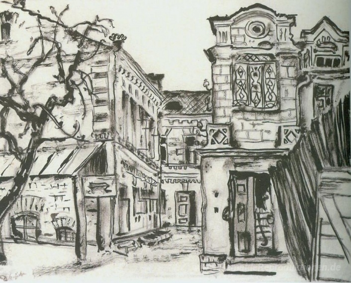 Wir bieten Ihnen eine handgefertigte Reproduktion auf Leinwand des berühmten Kunstwerks 'Kaunas, alte Häuser' von Mstislav Dobuzhinsky, aus dem Reproduktionsmuseum.