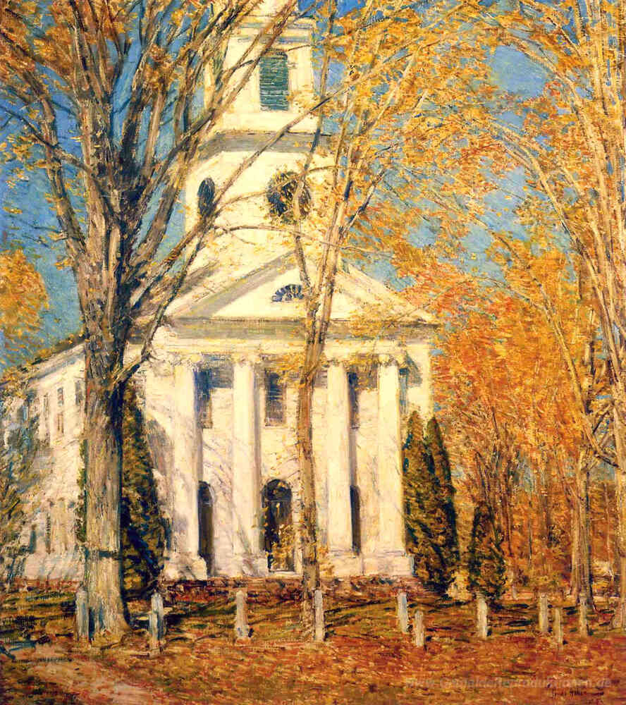 Wir bieten Ihnen eine handgefertigte Reproduktion auf Leinwand des berühmten Kunstwerks 'Kirche in Old Lyme' von Childe Hassam, aus dem Reproduktionsmuseum.
