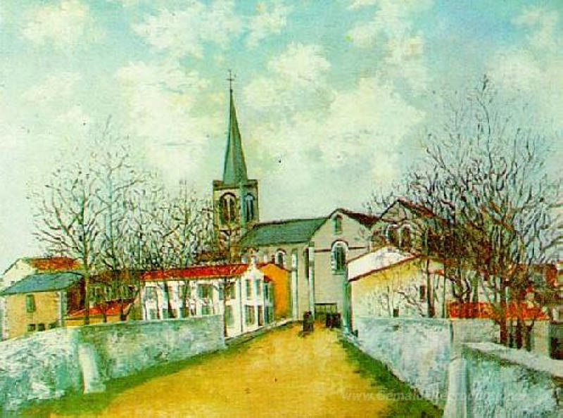 Wir bieten Ihnen eine handgefertigte Reproduktion auf Leinwand des berühmten Kunstwerks 'Kirche in Suburbs' von Maurice Utrillo, aus dem Reproduktionsmuseum.
