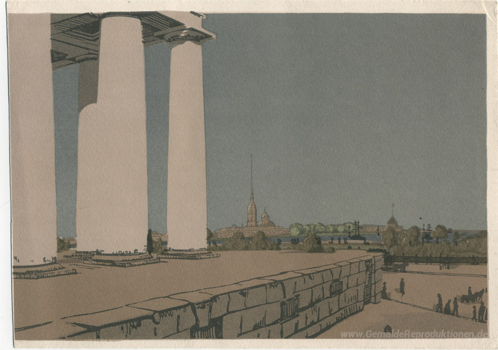 Wir bieten Ihnen eine handgefertigte Reproduktion auf Leinwand des berühmten Kunstwerks 'Kolonnade von Exchange und Peter und Paul-Festung' von Anna Ostroumova-Lebedeva, aus dem Reproduktionsmuseum.