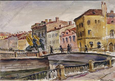 Wir bieten Ihnen eine handgefertigte Reproduktion auf Leinwand des berühmten Kunstwerks 'Leningrad. Lions Bridge.' von Pyotr Konchalovsky, aus dem Reproduktionsmuseum.