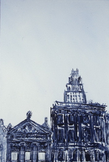 Wir bieten Ihnen eine handgefertigte Reproduktion auf Leinwand des berühmten Kunstwerks 'Light Blue Stadtbild nicht. 4' von Martha Diamond, aus dem Reproduktionsmuseum.