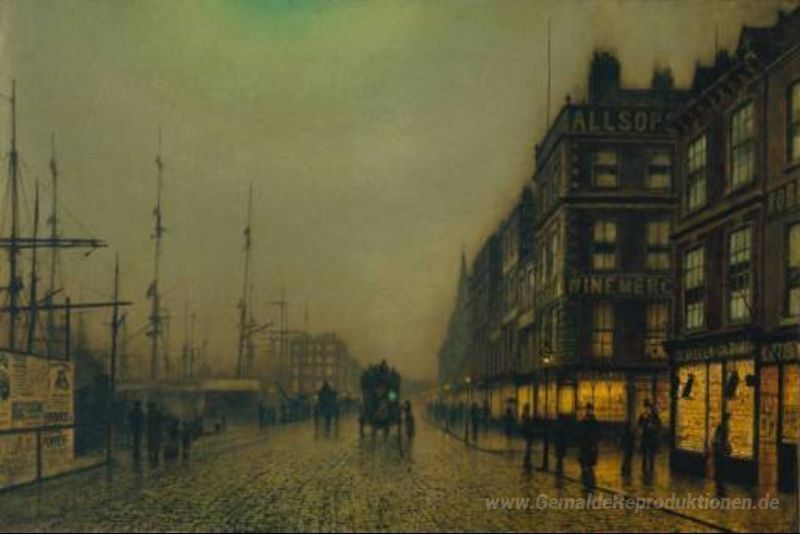 Willkommen in unserer exklusive Sammlung von Ölgemälden, wo die zeitlose Schönheit der Malerei auf handverlesenes Kunsthandwerk trifft. Jedes Gemälde erzählt eine Geschichte und entführt den Betrachter in eine Welt voller Emotionen und Symbolik. Unser herausragendes Exemplar, Liverpool Quay durch Mondschein, stammt von dem renommierten Künstler John Atkinson Grimshaw, bekannt für seine Fähigkeit, stimmungsvolle Nachtlandschaften einzufangen.
